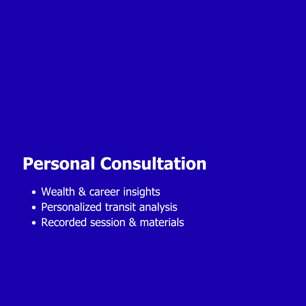 Give the gift of a 90-minute, one-on-one consulting session exploring the financial indicators in the recipient’s natal horoscope chart. This deep-dive session covers wealth and career indicators, current transits, secondary progressions, and a personalized long-term outlook on markets and the economy, all delivered through a detailed PowerPoint presentation.